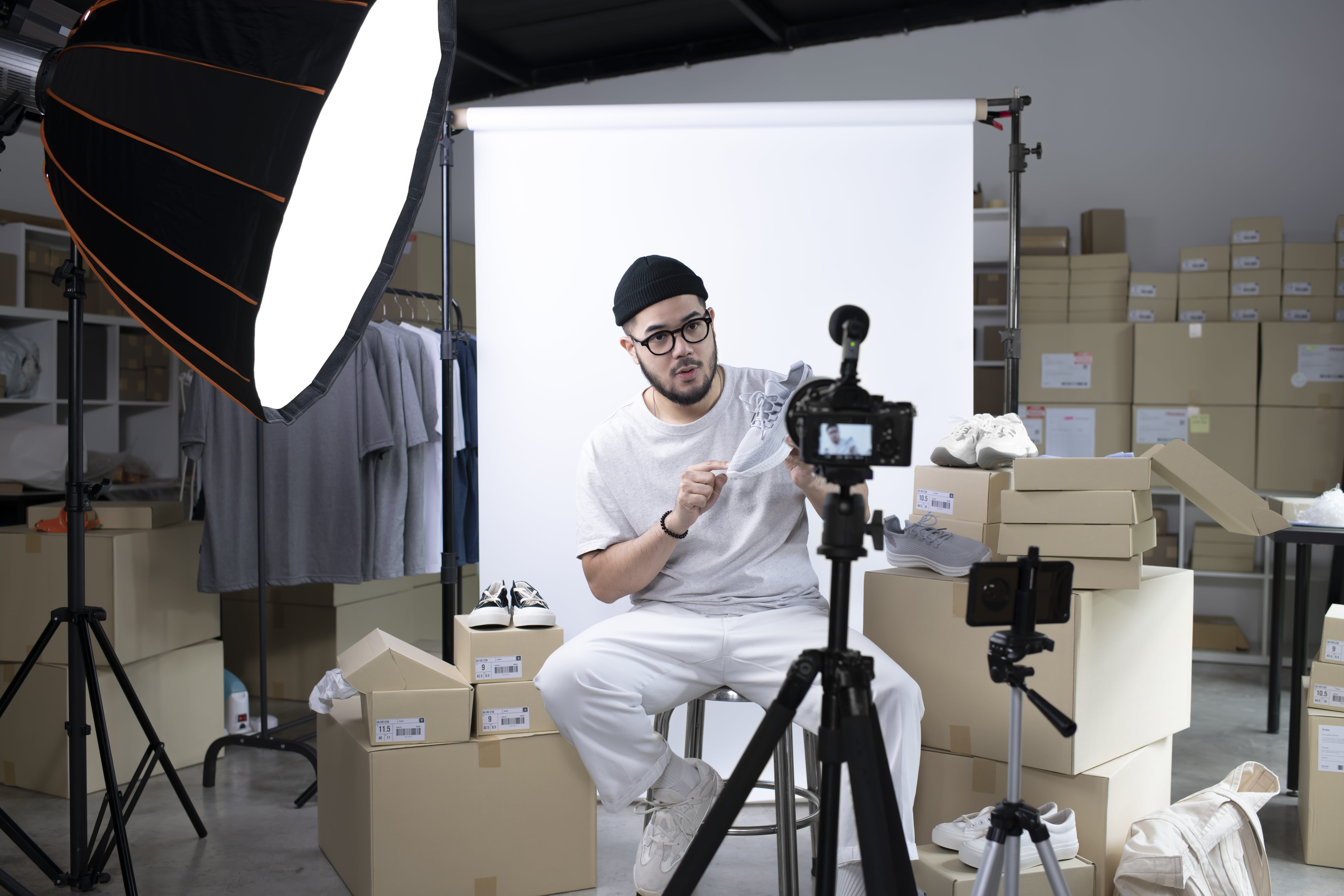 Young attractive Asian man blogger or vlogger looking at camera reviewing product. Modern businessman using social media for marketing. Business online influencer on social media concept.